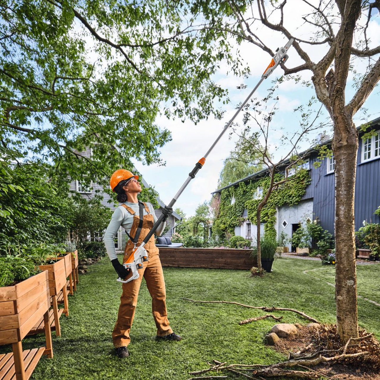 De telescoopsteel is traploos verstelbaar tot 280 cm, waardoor de totale lengte van het toestel tussen de 190 en 280 cm varieert. Volledig uitgeschoven bereik je een werkhoogte tot wel 4,5 meter. Na gebruik schuif je de steel eenvoudig weer in voor een vlot transport. Met één AS 2 accu heeft de HTA 30 een werktijd van ongeveer 28 minuten, goed voor tot wel 140 zaagsneden (gemeten op droog sparrenhout van 5 × 5 cm). Zo beschikt het toestel over ruim voldoende vermogen voor de meeste snoei- en onderhoudsklussen.