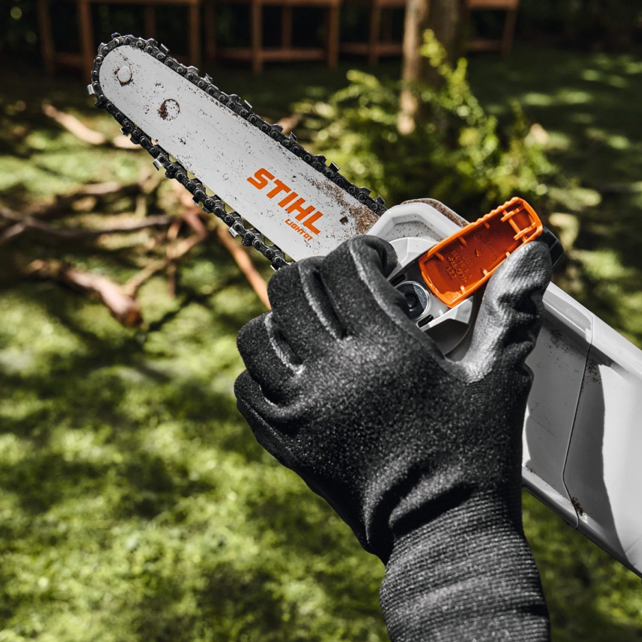 De intuïtieve en ergonomische STIHL HTA 30 accuhoogsnoeier is ontwikkeld om veeleisende particulieren efficiënt en comfortabel te laten werken bij het onderhoud van hun terrein, tuin en bomen.. Dankzij de gereedschapsloos verstelbare telescoopsteel met uitstekende geleidingsstijfheid en de automatische kettingspanning met geïntegreerd veermechanisme wordt het snoeien van hoge takken, het onderhouden van heggen en struiken en het verwijderen van dood hout een stuk eenvoudiger. De kettingspanning stel je in met één handbeweging: open en sluit het kettingwieldeksel en de ketting is meteen optimaal gespannen – snel, moeiteloos en zonder onderbreking van je werk. De in de takkenhaak geïntegreerde spanhefboom garandeert altijd de correcte spanning en zorgt zo voor een snelle en gereedschapsloze montage van de zaaggarnituur na het schoonmaken of vervangen van de ketting. Zowel de spanhefboom als alle andere bedieningselementen van de HTA 30 zijn eenvoudig te bedienen, ook met handschoenen aan.
